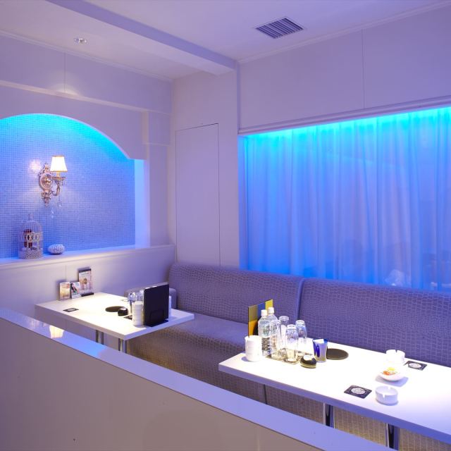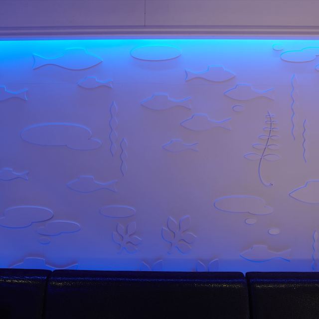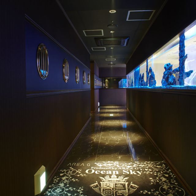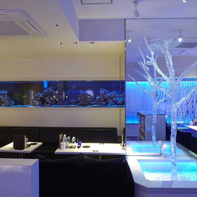 海をテーマに作っているお店です。 海の中をイメージさせる白い空間とそこを走る豪華客船のイメージの木調の空間があります。