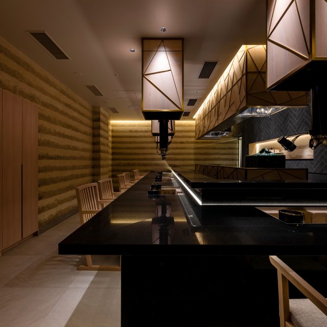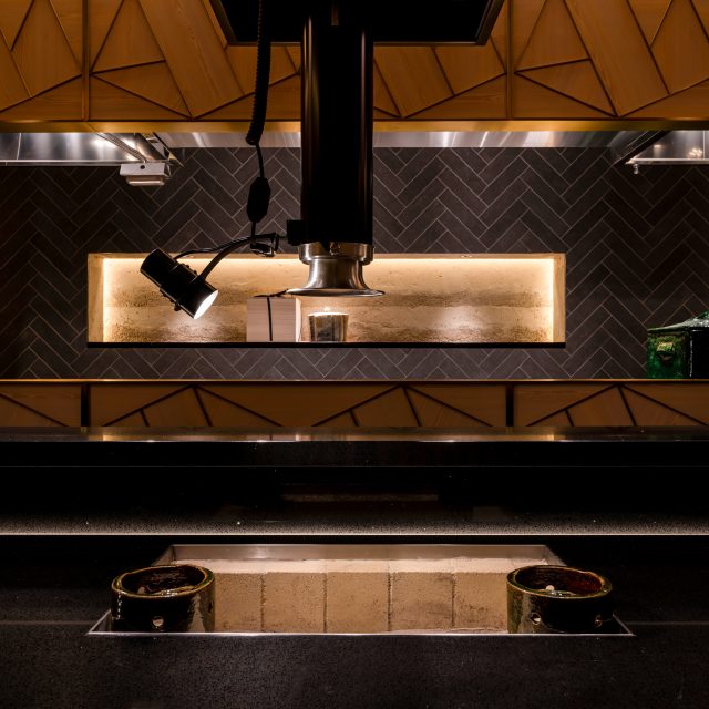 炭火の香りに浸る、静謐なる「囲炉裏会席」の隠れ家 空間デザインの核となるのは、力強いコテ跡を残した左官職人による塗り壁です。 炭や灰の粒子が含まれたようなそのテクスチャーは、照明の角度によって深い陰影を生み出し、 空間に圧倒的な静寂と包容力をもたらします。